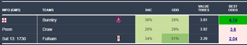 This week there are a couple more options than usual offering value in the Premier League, though the margins remain slim. First, Burnley at home to Fulham look undervalued despite being in the relegation zone. They have a 38% chance of victory compared with just 26% given by the bookies, meaning value at 3.01+, with odds of 4.14 available.