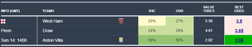 Next, Aston Villa away to West Ham represent solid value once again. The model gives Villa a 56% chance of winning compared with 50% from the bookies, implying value above 2.02, with odds of 2.08 currently available.