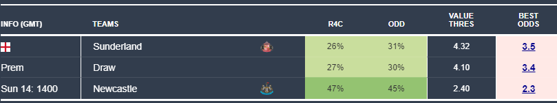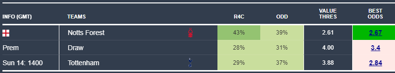 Finally, Nottingham Forest at home to Tottenham also stands out as a smart option. Forest have a 43% chance of victory against Spurs’ 29%, yet bookies only price them at 39%. Fair value is 2.61+, and 2.67 is out there — another small but worthwhile edge.