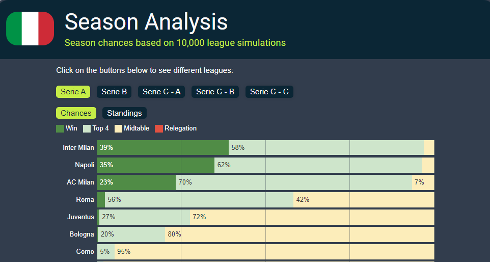 And yet, out of the smoke, Aston Villa have quietly emerged. Unai Emery’s side have been nothing short of electric, toppling Arsenal in dramatic fashion and putting together one of the most impressive runs of any team in Europe. Their reward? A 6% shot at the title. Sorry, Villa fans — you’re in the conversation, but you’re not winning it.