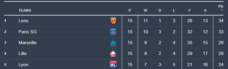 Over in France, after 15 games, shockingly, Paris Saint–Germain are not on top. Instead, Lens are in first place with PSG in second and Marseille in third.