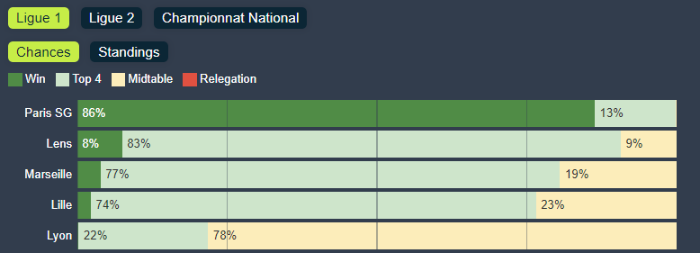 However, the algorithm is still confident that PSG will turn on the afterburners at some stage and blow away the opposition, giving them an 86% chance of league victory.