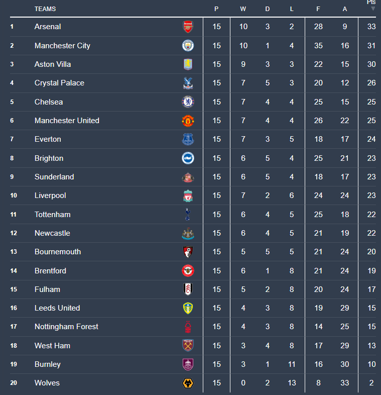 Sunderland have been this season’s surprise package, punching above their weight for months, but after a run of wobbles, they’ve slipped from 4th down to 9th. Their home form has kept them in the conversation, though — they’ve taken points off Arsenal and Bournemouth at the Stadium of Light and remain one of the league’s most spirited sides.