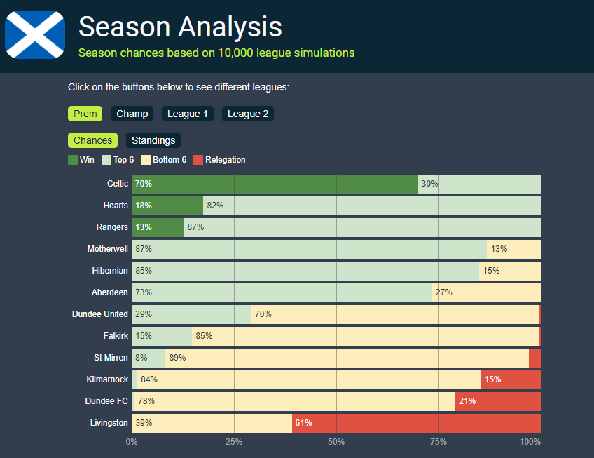 How do we come to our conclusions you may think? Well, we have (rather accurate) predictions for each match. For example, this weekend, Celtic have a 71% chance of winning at home to Aberdeen. So, our algorithm simulates a season with our predictions for every match, which naturally change depending on the previous results (it’s a long and painful process unless you are a robot with no feelings or sense of boredom and very good at maths), and then it does it 10,000 times.