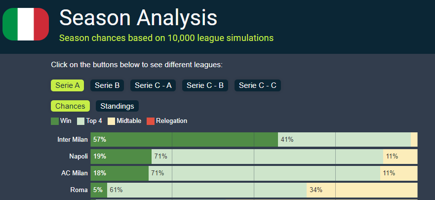 A real ding-dong is developing in Italy. Just three points separate Inter Milan and Roma in fourth, while AC Milan — rejuvenated and resurgent — are taking the fight to their city rivals. Reigning champions Napoli, despite battling a mounting injury crisis, are still hanging on in contention. However, the algorithm sees Inter as clear favourites, giving them a commanding 57% chance of lifting the title. Between them, Napoli and AC Milan account for around 40%, meaning the chase is very much alive — but Roma, despite their strong position, are unlikely to mount a serious challenge.