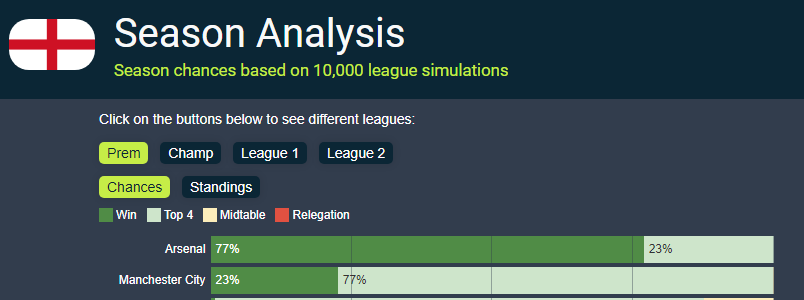 Their title chances are still high, as we suggested when everyone was losing their heads last weekend, but at 77% they are edging down. Man City again kick off earlier on Saturday, away at Leeds, while Arsenal are at home to Chelsea. With Leeds in decent form, it is hard to say who has the tougher fixture, but the algorithm has City at 58% to win and Arsenal at 61%, suggesting a slight advantage for Arsenal.