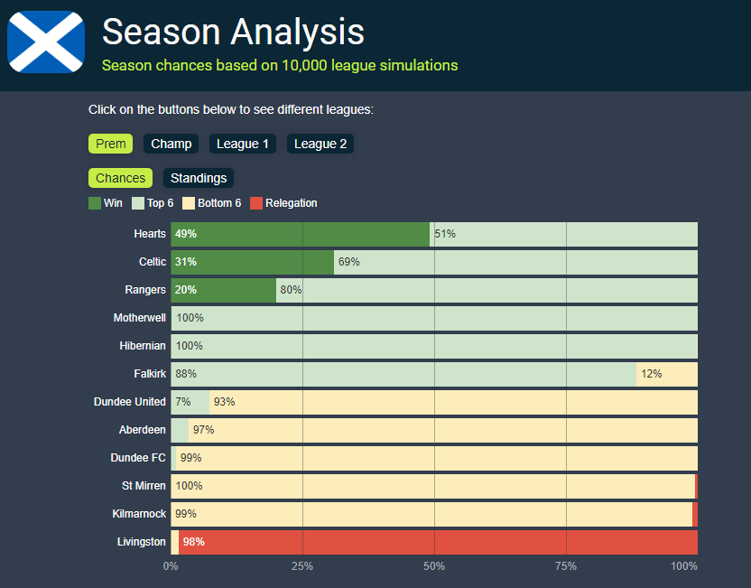 Hearts are increasing their chances of ending the duopoly for the first time in 40 years, as they move up to a 49% chance of taking the title, with Celtic falling back following a shock 2–1 defeat to Hibernian. Basement club Livingston also held Rangers to a draw, while Hearts beat Falkirk 1–0.