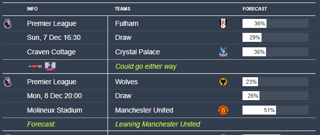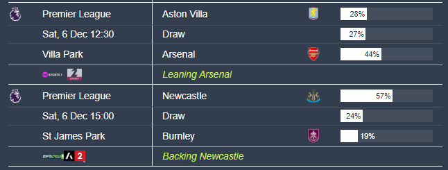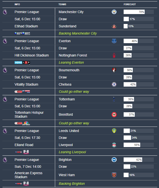 Elsewhere, Newcastle should enjoy a straightforward afternoon at home to Burnley, while Manchester City host an in-form Sunderland side but are still overwhelming favourites to take all three points. Everton face Nottingham Forest, holding a narrow 46% edge, while Bournemouth’s home meeting with Chelsea looks much harder to call — both sides equally capable of self-destruction on their day.