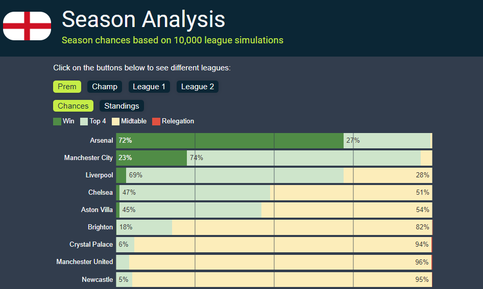 After 10,000 simulations, Arsenal remain untouchable and challengers are falling away. Arsenal hold a 72% chance of winning the title according to the model. Manchester City sit at 23%, with Liverpool now down to a barely perceptible 3.3%. Chelsea and Aston Villa ar ethe best outside of these big three, but each are still around 1.2%. One time in 100 Aston Villa could win the title, so never say never, despite our short answer above.