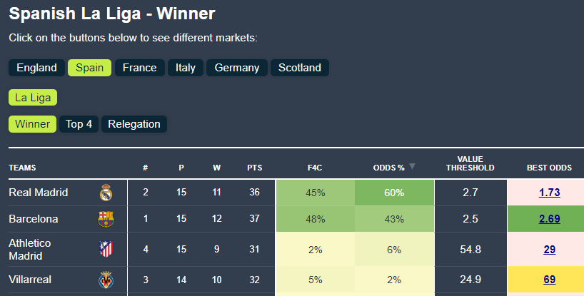 In Spain, Barcelona look slightly underpriced for the La Liga title. Our model gives them a 48% chance of success compared with the bookmakers’ 43%, translating to fair odds of 2.5 with 2.69 available — a small but meaningful margin for value hunters.