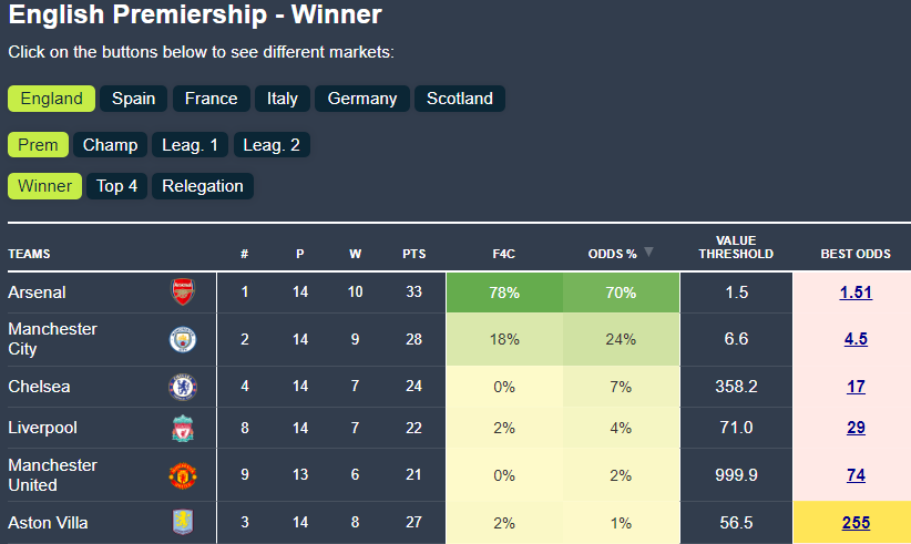 In the outright Premier League markets, there’s very little left to play for — at least according to both the numbers and the bookmakers. Arsenal are so dominant that you’d almost expect the bookies to start paying out already, even though we’re not yet halfway through the season. Our model gives them a 78% chance of winning the title, translating to fair odds of 1.5, and there’s only fractional value to be found — you might squeeze 1.51 in some markets, but it’s marginal.
