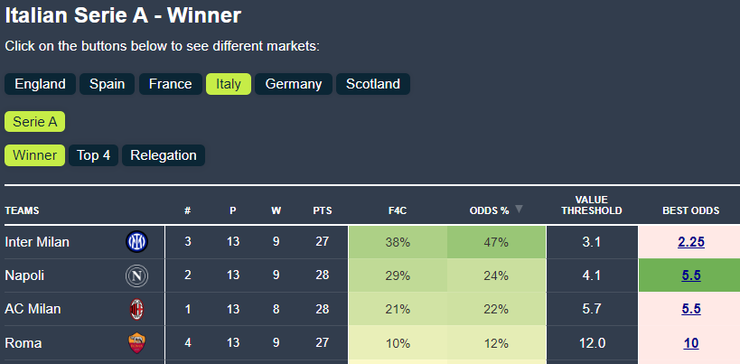 Over in Italy, Inter Milan appear significantly overpriced. The model puts them at 38% compared to the bookmakers’ inflated 47%, suggesting their dominance in the market doesn’t quite reflect reality. Meanwhile, Napoli offer marginal value, rated 29% by our data versus 24% with the bookies — not a huge edge, but one to keep an eye on as their form stabilises.