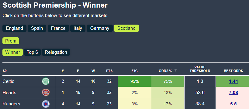 In Scotland, the best value in any major league right now lies north of the border. After a couple of weeks of uncertainty and a very brief Hearts’ title push, Celtic have a commanding 95% chance of retaining the title, compared to just 75% according to the bookies — a major discrepancy. At the other end, Hearts’ true probability sits closer to 2%, well below the 18% being offered, making them one of the most overvalued picks anywhere in Europe.