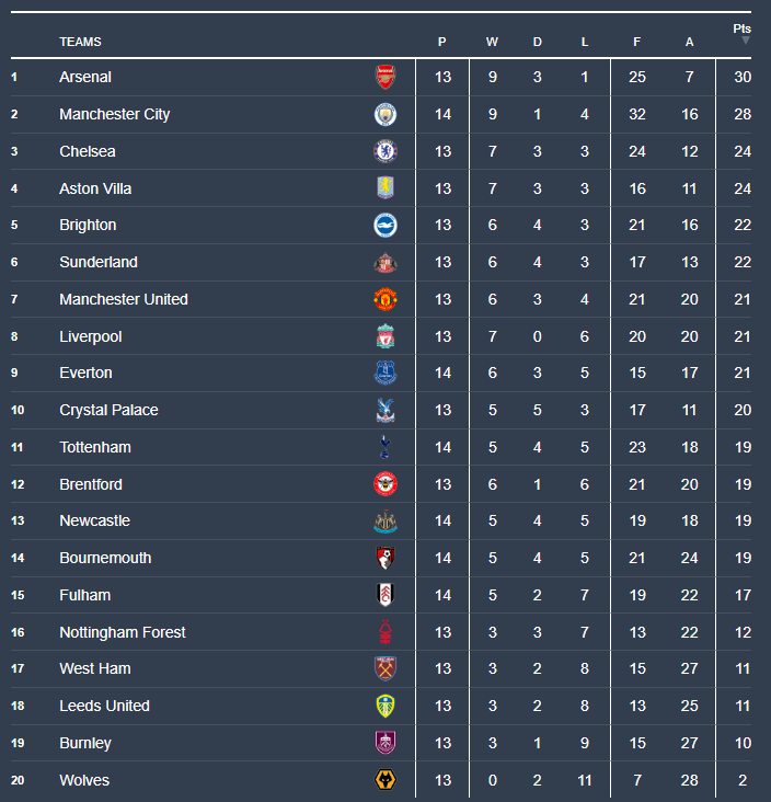 Last weekend, Brentford beat Burnley 3–1, Manchester City scraped past Leeds 3–2 after throwing away a two-goal lead, and Sunderland edged Bournemouth 3–2. Newcastle thrashed Everton 4–1 away, Tottenham slumped to a 2–1 home defeat against Fulham, while Crystal Palace lost 2–1 to Manchester United. Liverpool steadied slightly with a 2–0 win at West Ham after a torrid run, Aston Villa beat Wolves 1–0, and Brighton comfortably won 2–0 away at Nottingham Forest. On Sunday, Chelsea — despite being down to ten men — were the better side in a 1–1 draw with Arsenal, raising the question of whether Chelsea might actually be emerging as surprise contenders.