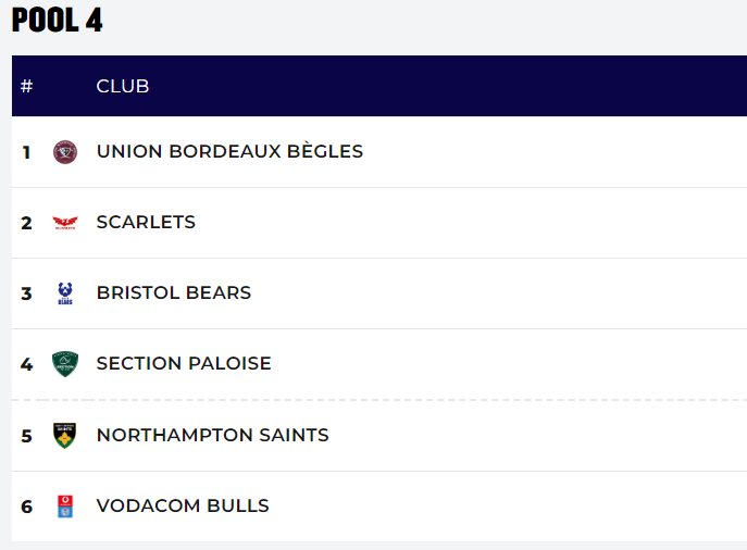 In Pool 4, Bordeaux begin their title defence as strong favourites to progress. Their mix of forward power and fluid backline play makes them a nightmare matchup for anyone, and they should have little trouble finishing top. Northampton’s all-round quality makes them favourites to take second, while Bristol are capable of pushing through as one of the more unpredictable teams in the competition. Pau, back in Europe’s top tier, might sneak results at home but will find the away trips tough, while the Bulls and Scarlets look destined for early exits.