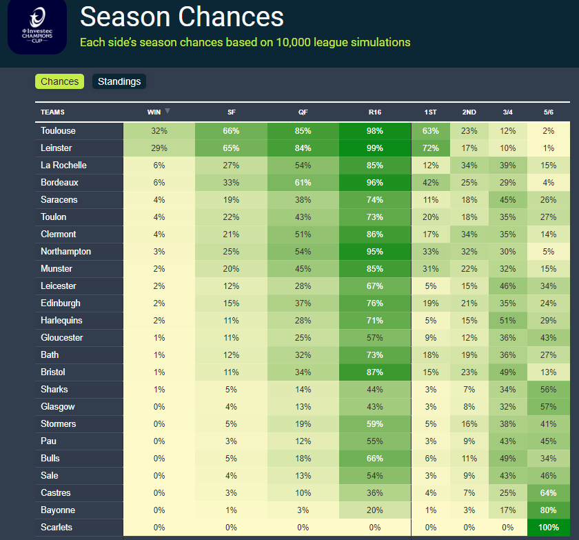 The R4C algorithm has spoken — and it sees a two-horse race emerging. Toulouse lead the way with a 33% chance of lifting the trophy, reaching the semi-finals in two-thirds of our simulations. Leinster are close behind at 29%, overwhelming favourites to top their pool and once again looking like Europe’s most complete side.