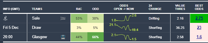 As for individual matches, there is one standout option this weekend: Sale v Glasgow on Friday night. Sale are value at 2.16+ with home advantage and odds of 2.75 are available!