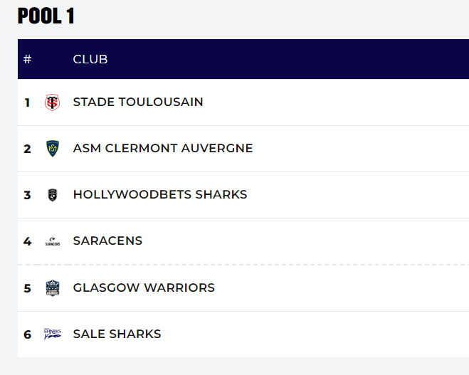 In Pool 1, Toulouse look formidable. The French champions are favourites not only to win the pool but to go deep into the tournament, carrying all the hallmarks of a side that knows how to handle European pressure. Saracens should have enough power and experience to join them in the top two, with Clermont likely to be dangerous on home soil and Sale pushing for the final qualification spot. Glasgow and the Sharks will compete hard but appear outmatched across four rounds. Expect Toulouse to dominate and Saracens to follow closely behind.