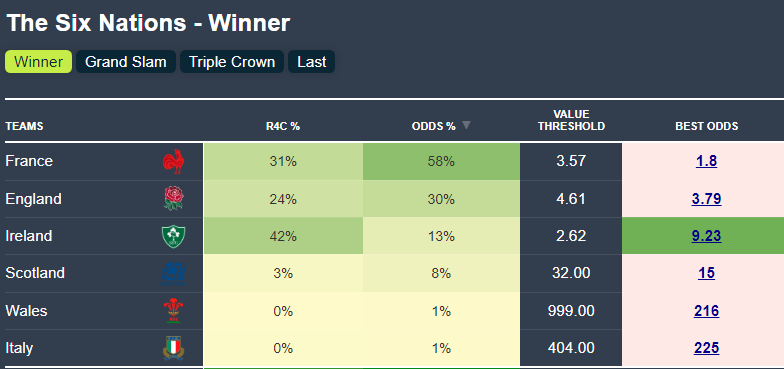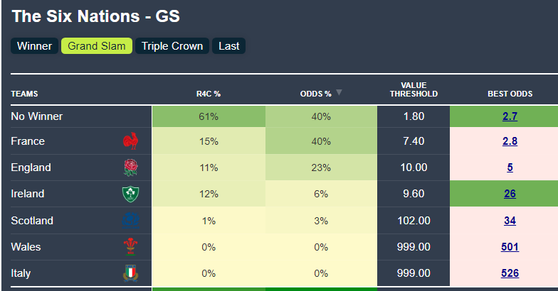 Similarly, France are wayyyy overpriced for the Grand Slam. Just under 50% of Six Nations have finished in a Grand Slam, and in a year where there are 3 very strong sides, and at least one other capable of upsetting anybody on their day, it feels more unlikely this year!