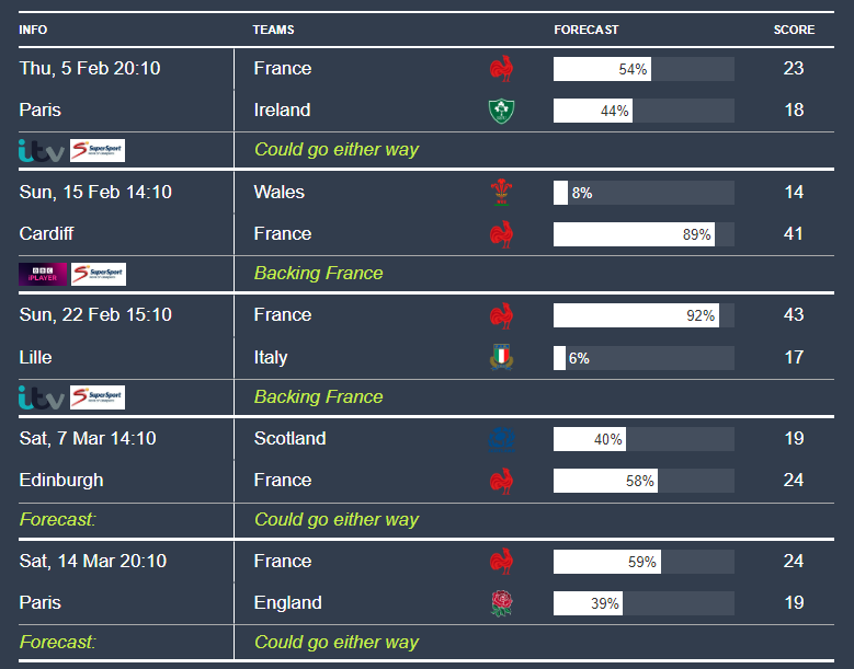 France face Ireland in the first match of the tournament at home in what is a very important match but maybe not quite as tournament deciding as some are saying. France also face England at home in the final game of the tournament which could be a tournament decider. Basically, all of the matches between France, Ireland and England are statistical toss-ups. If each side wins one and loses one, then the other fixtures take on great significance. Away at Wales and home to Italy should be comfortable victories. They key fixture is away at Scotland. England also have to travel to Scotland whilst Ireland have Scotland at home. It is this which makes it more likely that France win a Grand Slam (they have Ireland and England at home), but that Ireland are more likely to win the Championship overall.