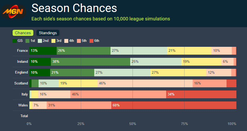 Surely that means that they should not be favourites? Well, in a nutshell, France, Ireland and England are actually ranked very close together these days. Therefore, all the matches between these three heavyweights are incredibly close to call, even with home advantage. For example, England v Ireland is predicted to finish 19–18 in favour of England, which essentially means it is a toss-up. Either side can take the victory. Thus, these matches cancel each other out probability-wise. It is statistically probable that each side wins one and loses one. Commentators who are calling the opening match of the tournament between Ireland v France as the potential tournament decider are way off the mark.