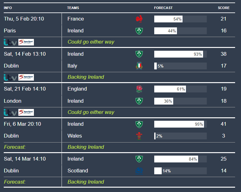 So, what’s going on with the model for Ireland? Are they really favourites to win the tournament? Ireland have three matches at home and two away. That is always a good start. Ireland face Italy, Wales and Scotland at home, the weaker teams outside of the big three. In each of those matches, they are heavily favoured to take the victory. This does mean that they face France and England away from home.