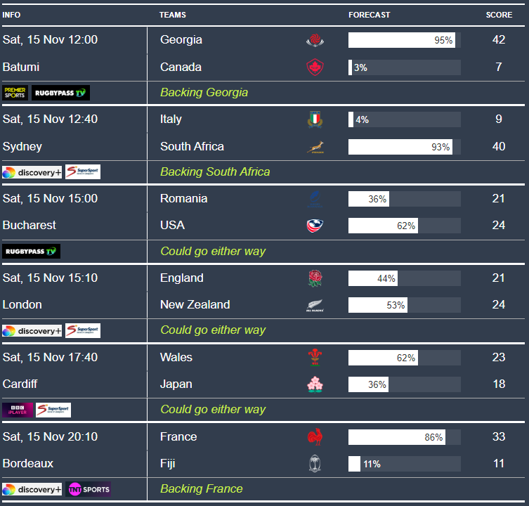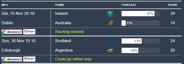 The other intriguing tie is Scotland v Argentina — another near-even contest. Our model puts Scotland at 53% and Argentina at 44%, and given how closely these sides sit in our rankings (Argentina 6th, Scotland 7th), this could be one of the best games of the weekend. Don’t be surprised if the Pumas take it — this fixture often turns on momentum. Scotland will be looking to bounce back after taking New Zealand all the way last weekend. Argentina, on the other hand had a comfortable victory over Wales to get their Autumn going. Will Argentina be a little too fresh for Scotland?