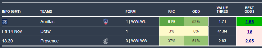 The best betting opportunity outside the international fixtures comes in France’s Pro D2, where Aurillac host Provence. Our model gives Aurillac a 61% chance of victory compared to 51% in the market, offering a tidy margin for value hunters.