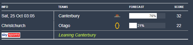 Earlier on in the season Otago edged out Canterbury in a classic, 38-36 so expect the final to be closer than maybe the computer expects.