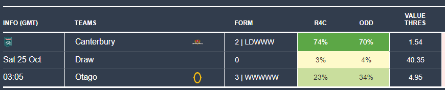 Our model gives Canterbury a commanding 76% chance of victory. The bookmakers broadly agree, though they rate Otago slightly higher than we do. There’s limited value in the market, but if you’re hunting small edges: