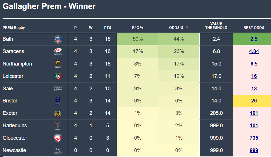 Overall, Bath remain clear frontrunners, with our model giving them a 50% chance of lifting the trophy compared to 44% from the bookies. We would suggesting steering clear of Saracens at this point as they are overvalued by 9 points. Bristol at 26.0 are a worthwhile long shot at this point.