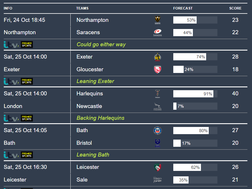 - Exeter v Gloucester – Exeter are favourites, though Gloucester retain a 21% chance of victory.