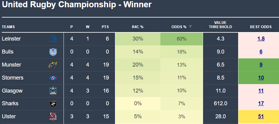 The URC table is taking shape, and some early pricing discrepancies have emerged. Despite winning just one of their opening four, the bookmakers still hand Leinster a 60% chance of retaining the title. Our model is far less convinced, cutting that figure to 30%. Leinster should be fairly comfortable winners to get back on track at home to Zebre this weekend.