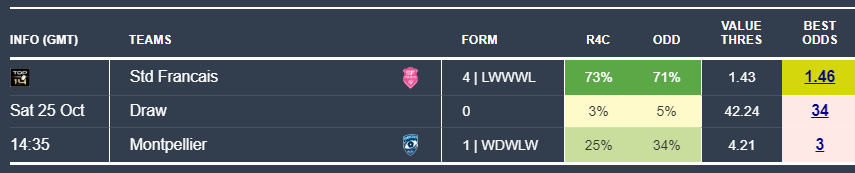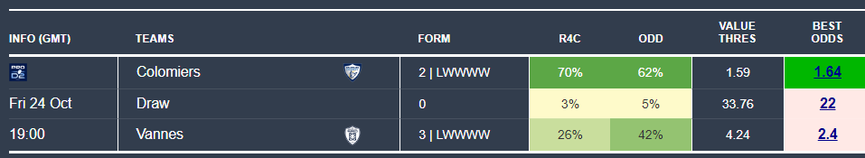 Our Top Tip of the Weekend comes from Colomiers v Vannes: Colomiers hold a 70% chance of victory (vs 62% from the bookies). Value threshold: 1.59+ with odds of 1.64 currently available.
