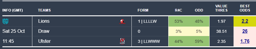 Lions v Ulster (URC) – Look for 1.97+, with 2.2 available.
