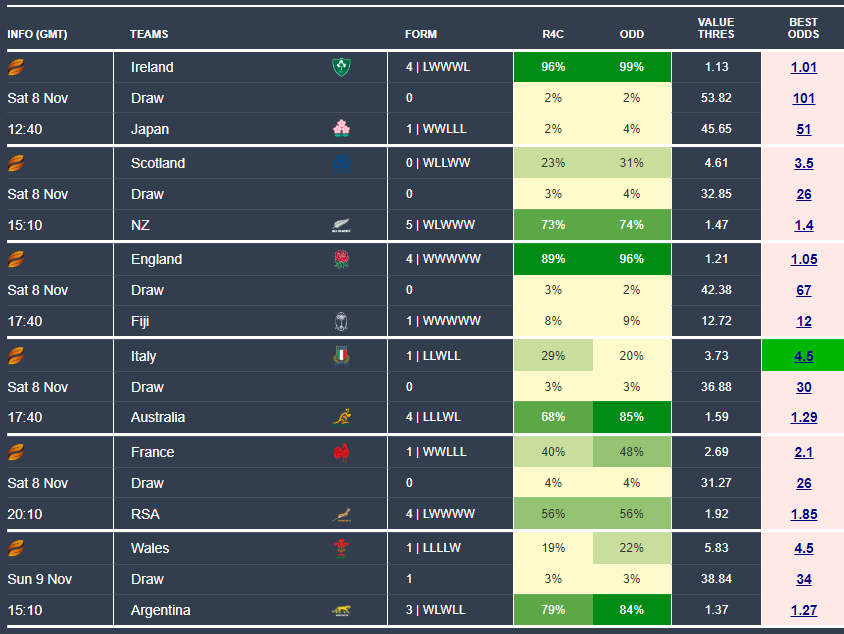 As we move into the second week of the Autumn Internationals, the betting markets have largely settled — and, for the most part, our model and the bookmakers are in broad agreement. The prices across the board are tight, with few obvious outliers. Still, one or two fixtures stand out on closer inspection.