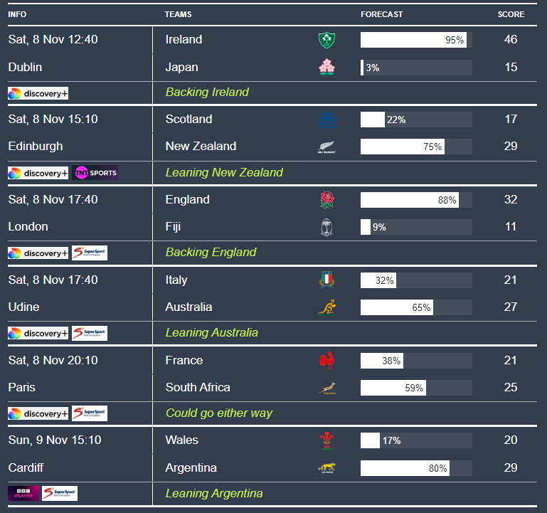 Wales’ slump continues; they’ve dropped down the world rankings after a run of poor results. Argentina, by contrast, are trending upwards and are 80% favourites to win, with Wales just 17%. The Pumas’ attacking width and defensive line speed could overwhelm a Welsh side short on confidence.