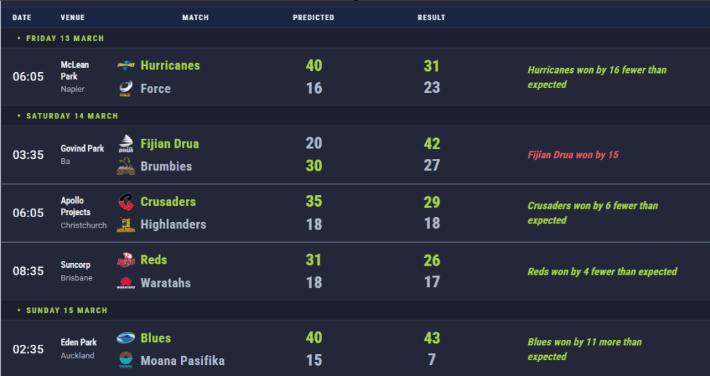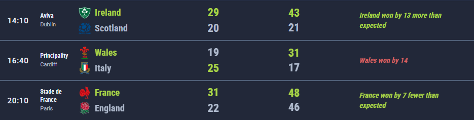 On the title race itself, we were very close. We predicted that the matches between the top three would be tight, with each team likely to win one and lose one. That left the Scotland fixture as the pivotal match for all three, with France and England having to travel to Murrayfield while Ireland had the advantage of playing them at home. We called Ireland to win the tournament on that basis. They nearly did, matching France on wins but falling just short on bonus points.