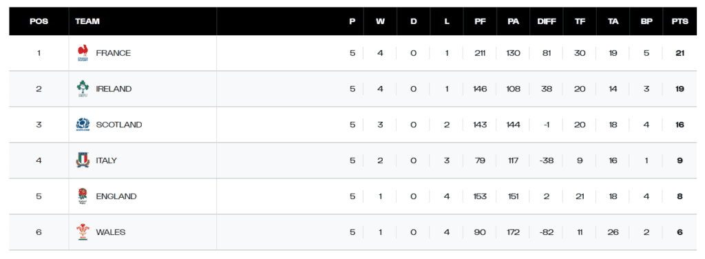 Welcome to the Six Nations 2026 Final Review. Last weekend saw France take the title as they managed to overcome a much improved England side in a brilliant match which required Ramos to kick a last-minute penalty to seal the title. It was a fitting finale for an excellent competition that saw many memorable matches. Earlier, Ireland had ended Scotland’s chances of a first title by crushing them in Dublin. Italy also fell at the final hurdle, looking to complete their best showing in the tournament, they went down 31-17 to Wales.