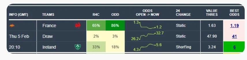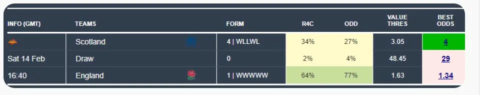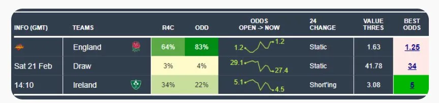 From there, four from four. We identified Scotland as value against England at 4.00, a call that looked bold given England arrived on the back of eleven straight wins. Our best pick was identifying Ireland as value against England at 5.00, and again the market was badly wrong.