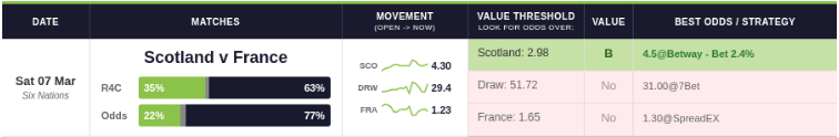 From the very first match, we were looking for value rather than simply backing the favourite. France v Ireland opened the tournament and whilst the bookies had France at 86% probability, we identified Ireland as the value bet at 3.24. France won, so that one didn’t come off, as Ireland didn’t show up and got pasted.