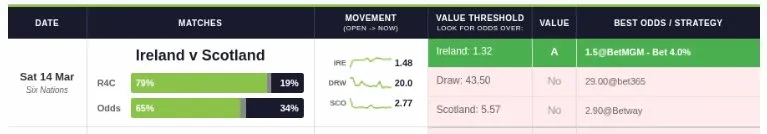 We spotted value on Scotland against France at 4.50 — another Murrayfield upset the bookies didn’t see coming. And finally, Ireland v Scotland, where we backed Ireland at 1.50 — a more conservative pick but still the value play.