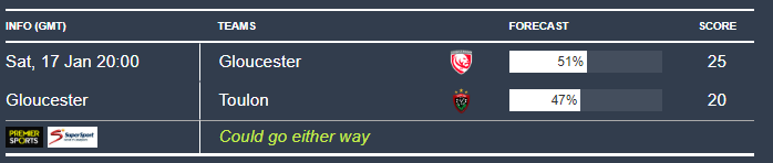 Toulon travel to Gloucester in one of the most finely balanced fixtures of the weekend. A win could see them jump into the top two and potentially claim a home knockout tie, but there is very little margin for error. Gloucester need a victory to leapfrog Toulon (whilst stopping them getting a BP), as Munster should win their match. Looks like the Challenge Cup beckons for them.