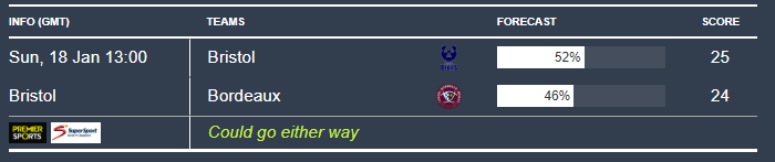 Bristol have been outstanding in the group stage. Their 61–49 win away to the Bulls last weekend underlined their attacking threat, and they come into this fixture as very slight favourites. A win could see them finish top of the pool and significantly improve their seeding if Bristol can get a result at home to Bordeaux.