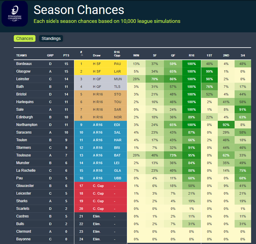 At the top end, sides like Bordeaux, Glasgow and Leinster are battling for the highest seeds and a smoother projected route through the competition. Just below them, Bath, Bristol, Harlequins and Northampton are fighting to stay on the right side of the cut.
