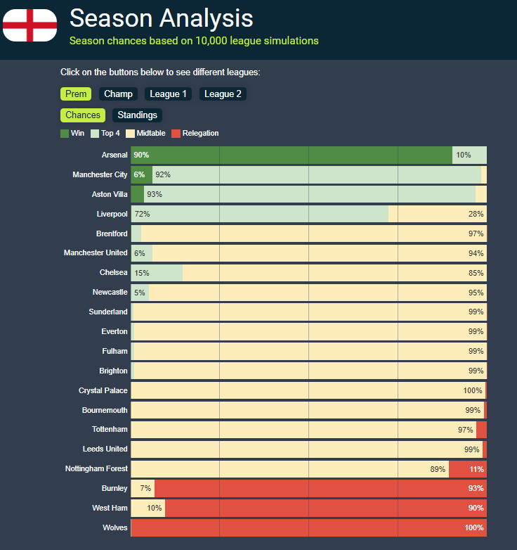 That was our big cutout quote last weekend. And guess what? City lost 2-0 to Manchester United, and lo and behold the title race is all but over. The limp 2–0 defeat in the derby was the final blow to any lingering hope of a late surge, even with Arsenal only drawing away at Nottingham Forest. The damage is done. Arsenal remain firmly in control, and despite the odd stumble, the model now has them at a whopping 90% chance of winning the title. At this stage of the season, that’s usually terminal. City look a shadow of themselves, Aston Villa have failed to capitalise, and Liverpool are way off the pace to mount a serious challenge. It’s not mathematically over — but it’s very close to being practically over.