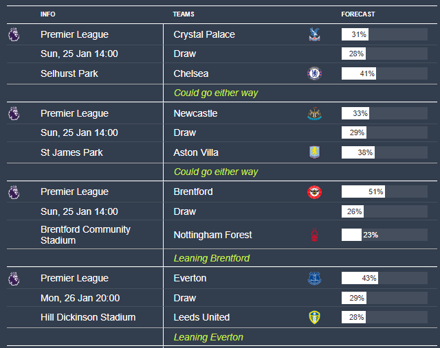 The headline fixture arrives on Sunday at the Emirates. Arsenal v Manchester United has rarely felt this one-sided on paper. Arsenal are close to 70% to win, United barely registering as a threat. The algo suggests that it’s another opportunity for Arsenal to tighten their grip at the top. However, Carrick has reinvigorated Manchester United, but it would be a real surprise if they win at the Emirates. Elsewhere, Crystal Palace v Chelsea and Newcastle v Aston Villa both sit firmly in “could go either way” territory, while Brentford are expected to do enough at home to Nottingham Forest. Everton v Leeds on Monday night closes the round with Everton holding a narrow edge in a match that could matter at the bottom end.