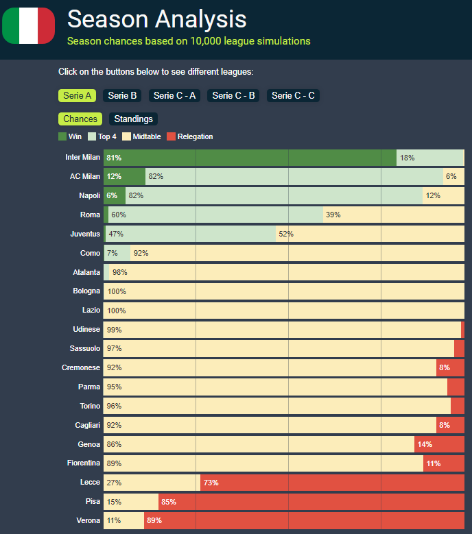 Often the league with the most action at the top, this year is probably going to turn into a procession. Despite just three points separating the top four on the table, our model now gives Inter an 81% chance of lifting the Scudetto, reflecting not just their league position but their consistency, goal difference, and experience in closing seasons out. AC Milan and Napoli remain mathematically close, but their title probabilities lag well behind, while Roma’s challenge looks more fragile despite staying within touching distance. In short, the table suggests a race, but the underlying numbers point firmly in one direction — Inter are increasingly in control, even if the gap doesn’t yet show it.