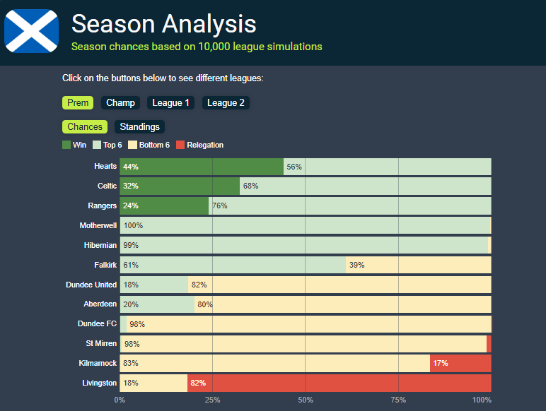For the first time this season, and probably a decade, CELTIC ARE NO LONGER FAVOURITES TO WIN THE TITLE! Hearts have gone ahead on 44% with Celtic behind on 32%. The gap is currently 6 points. However, this weekend Celtic head to Tynecastle and a victory could cut the gap to just three points. But Hearts know that a victory would be a giant step towards the title.