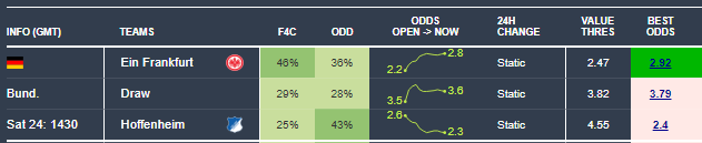 Over in Germany, Eintracht Frankfurt are undervalued at home to Valladolid. Look for odds of 2.47+.